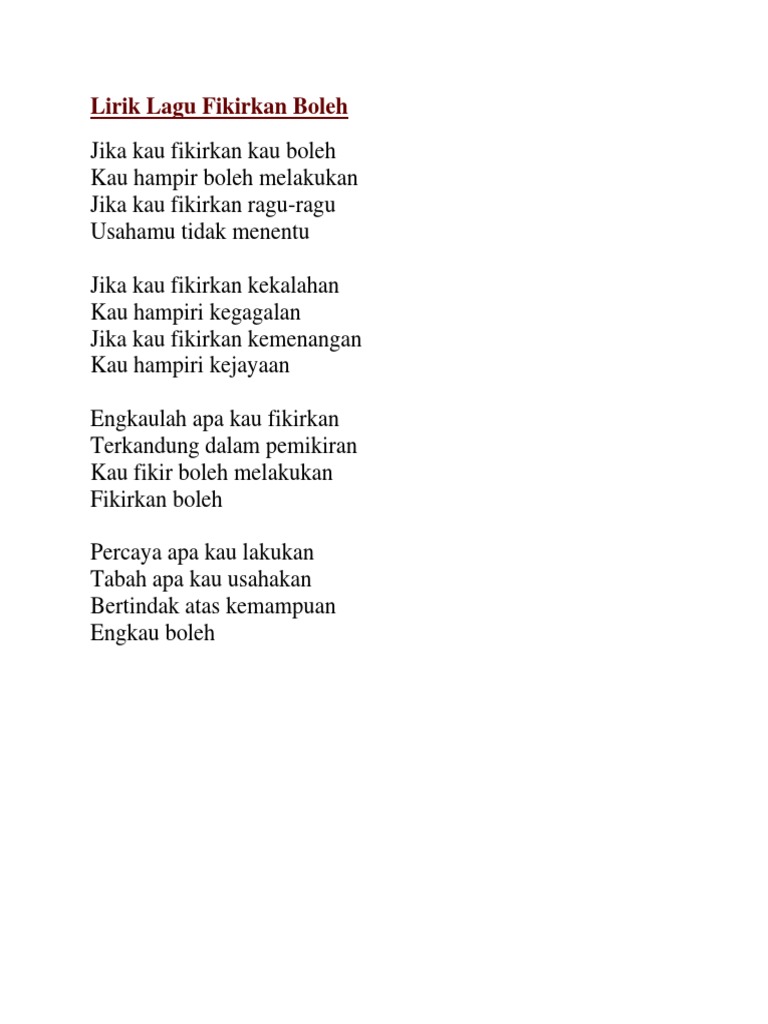 Kau boleh Kau boleh huh Jika kau fikirkan kau boleh Kau hampir boleh melakukan Jika kau fikirkan ragu-ragu Usahamu tid. Video Klip Lagu Fikirkan Boleh Lagu Patriotik. Tuesday 13 September 2011.
