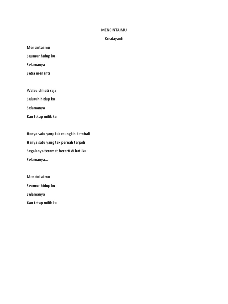 Selamanya kau tetap milikku. Mudah-mudahan isi postingan kunci gitar yang saya tulis ini dapat anda pahami. Kris Dayanti Mencintaimu Mencintai mu Seumur hidup ku Selamanya Setia menanti Walau di hati saja Seluruh hidup ku Selamanya Kau tetap milik ku korus Hanya satu yang tak mungkin kembali Hanya satu yang tak pernah terjadi Segalanya teramat berarti di hati ku.